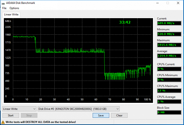 Несложно также заметить «грамотные» настройки SLC-кэширования, что в моделях на Silicon Motion встречается не всегда. В однобитном режиме накопитель записывает до 15% свободной емкости, после чего переходит в режим прямой записи. Скорость, конечно, снижается, но остается достаточно высокой еще «на протяжении» целого терабайта. Далее начались попытки расчистить кэш с характерной «пилой» и провалом ниже 1 ГБ/с. Но, в общем, чуть более получаса на полную запись 2 ТБ — результат неплохой: в среднем это как раз тот самый 1 ГБ/с и дает, что для многих накопителей является не средним, а максимальным результатом. А вот максимальный здесь явно невелик, но до заявленных 2200 МБ/с не так уж и далеко.