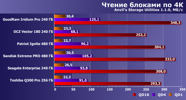 Что касается оценки «полосы пропускания», которая в большей степени привязана собственно к устройству, а не ко всей системе, тут уже разброс результатов превышает 30%. Потенциально самым медленным является Patriot Ignite, но он, как видим, почти не уступает топовым устройствам прошлого. Лидируют «марвелоиды», причем SanDisk Extreme Pro, который был одним из самых быстрых (из протестированных нами) накопителей, уже заметно отстает от Toshiba Q300 Pro.