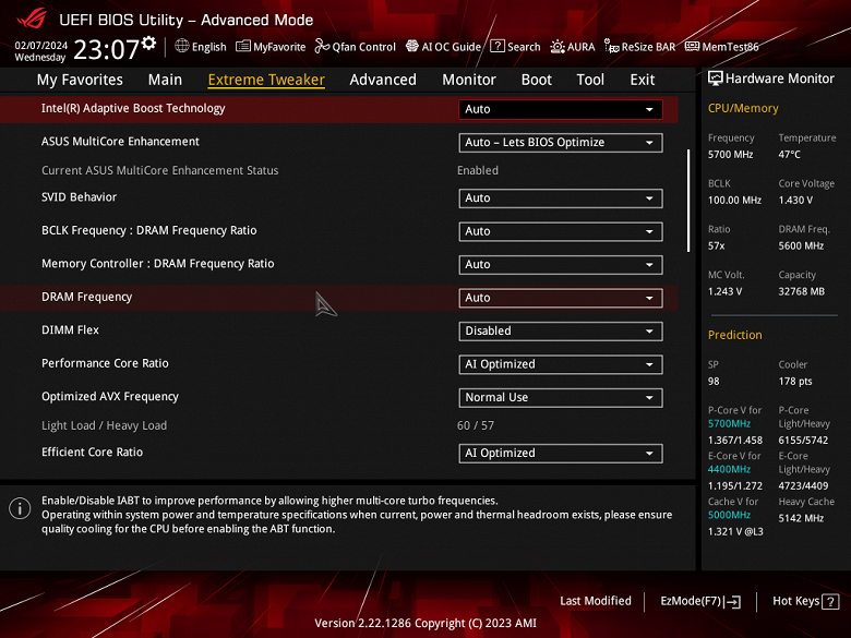 Уже весьма стандартно для топовых матплата мы получили 5,7 ГГц по всем P-ядрам, и 4,4 ГГц по всем Е-ядрам при автоматическом разгоне. Напомню, что Р-ядра — это обычные всем привычные ядра, имеющие по 2 потока каждый, «Р» — означает Performance, то есть производительные. «Е» — это энергоэффективные ядра, так называемые, малые ядра, у них по 1 потоку. Все параметры системы по нагреву компонентов были в норме.