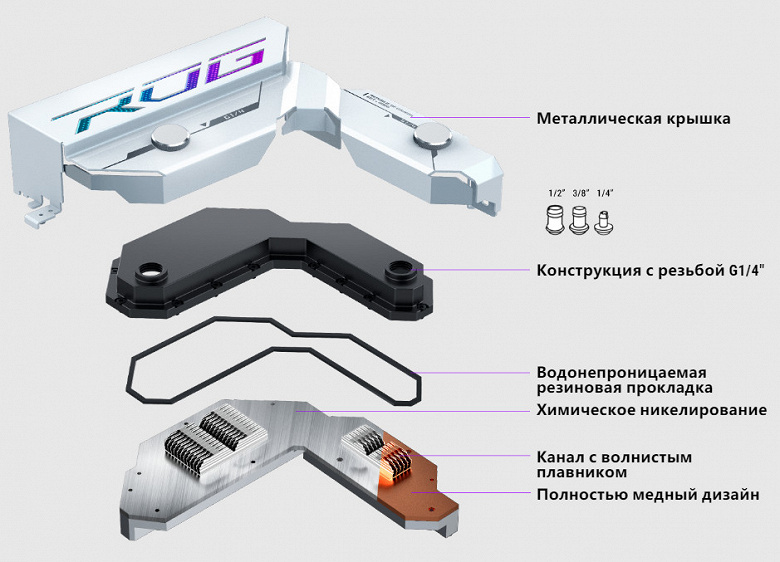 VRM-секция имеет свои два радиатора, соединенные тепловой трубкой под прямым углом в единый водоблок Asus HybridChill.