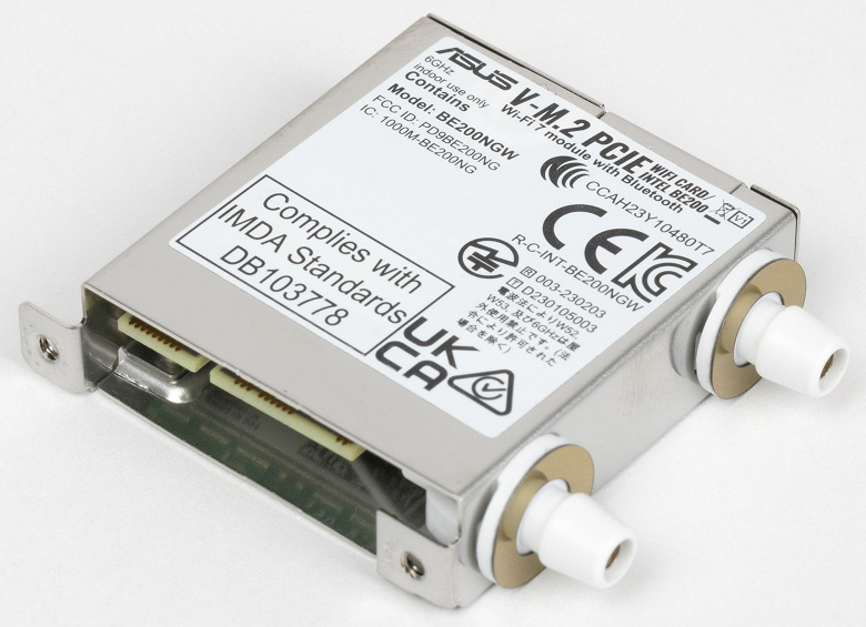 Имеется и самый современный комплексный беспроводной адаптер на контроллере Intel BE200NGW, через который реализованы Wi-Fi 7 (802.11a/b/g/n/ac/ax/be) и Bluetooth 5.4. Он установлен в слот M.2 (E-key), и его разъемы для подключения выносных антенн выведены на заднюю панель.
