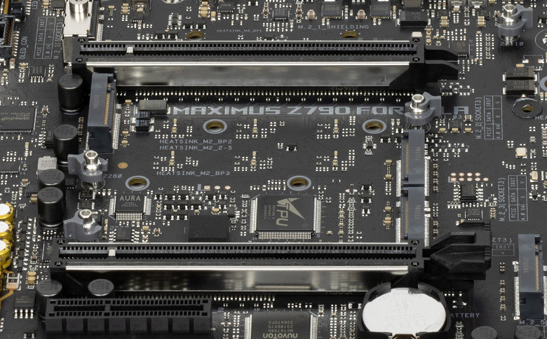 Третий, четвертый и пятый слоты M.2 (M.2_3, M.2_4, M.2_5) получают данные от чипсета Z790, а первые два — от CPU, при этом M.2_1 соединен линиями PCIe 5.0, а M.2_2 – PCIe 4.0.