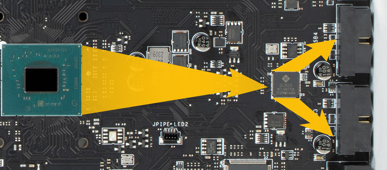 А также имеются усилители (ре-драйверы) сигнала PCIe 4.0 от ASMedia.