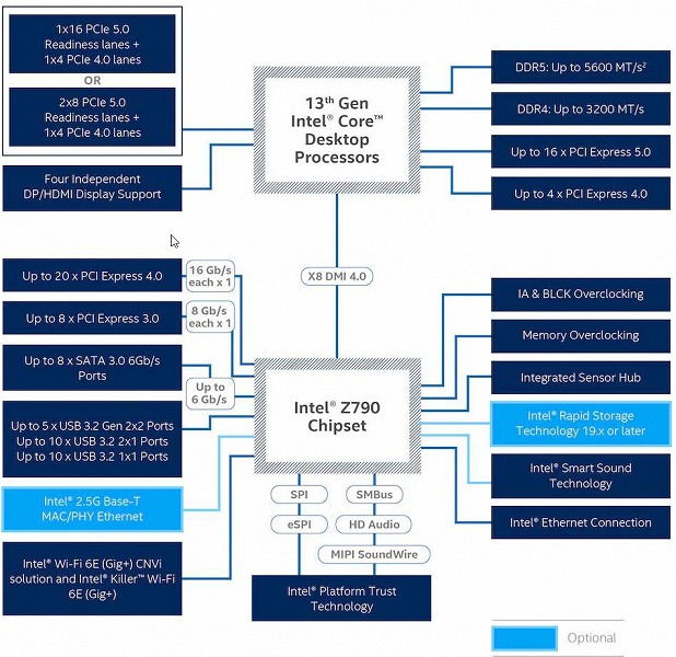 Процессоры Intel Core 13/12-го поколений (совместимые с сокетом LGA1700 и поддерживаемые Z790) имеют 20 линий ввода-вывода (16 PCIe 5.0, 4 PCIe 4.0), не имеют USB и SATA портов. При этом взаимодействие с Z790 идет по особому каналу Digital Media Interface 4.0 (DMI 4.0 x8). Все PCIe линии процессора идут на слоты расширения PCIe и порт М.2. Serial Peripheral Interface (SPI) используется для взаимодействия с системой UEFI/BIOS, а шина Low Pin Count (LPC) — для связи с устройствами ввода/вывода, не требующими высокой пропускной способности (контроллерами вентиляторов, TPM, старой периферии).