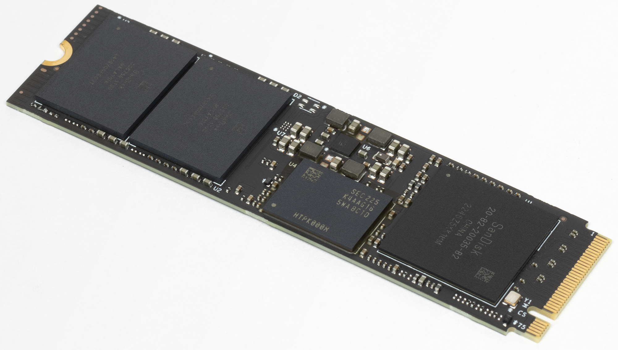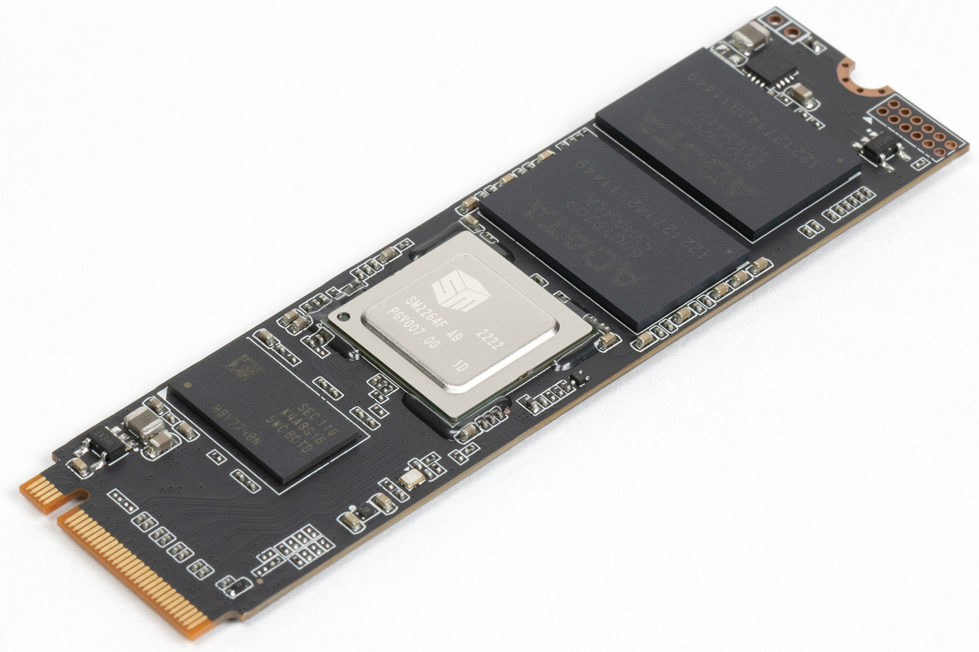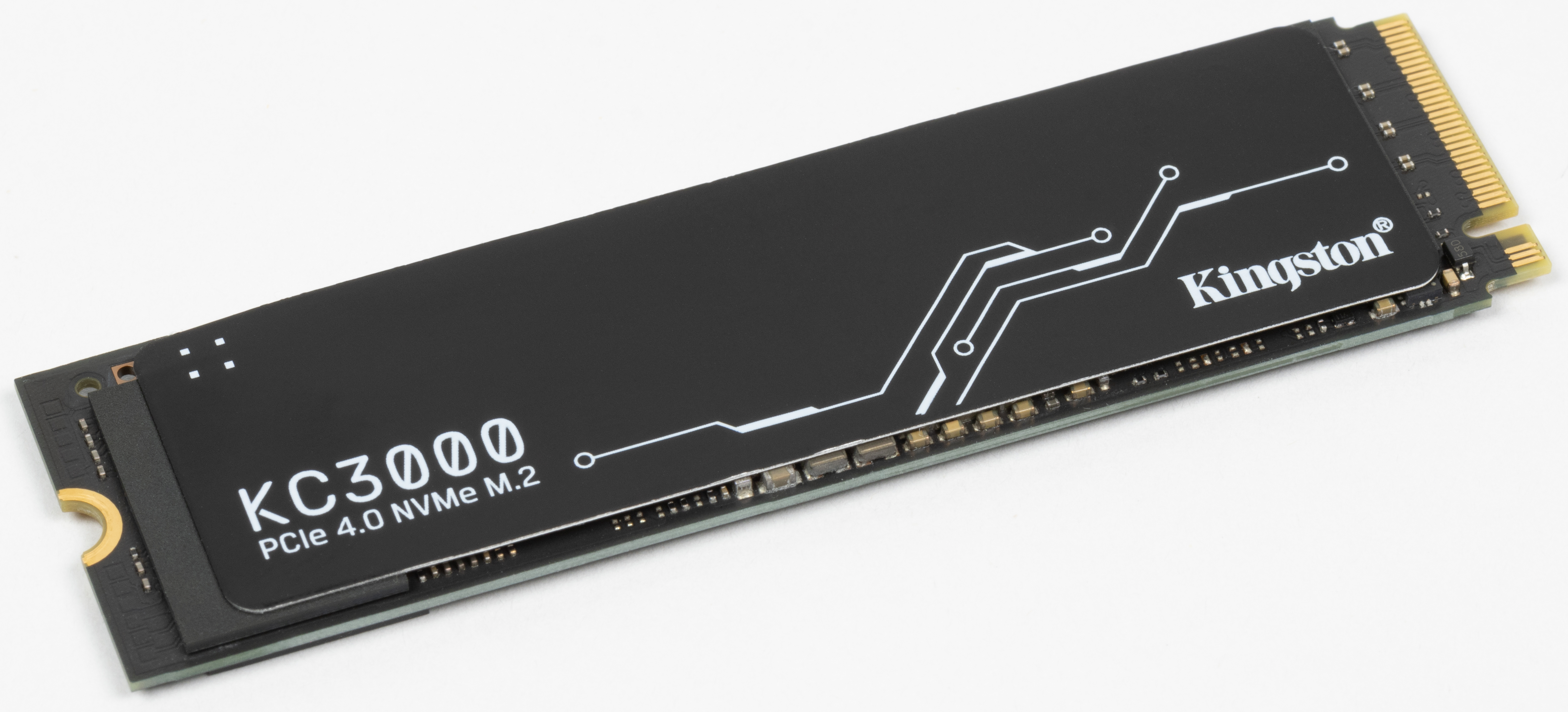 Дизайн самих плат вообще стал стандартным. Терабайтники Kingston обычно отличались от большинства прочих более плотной упаковкой флэша в чипы, что позволило установить не одну, а две микросхемы DRAM. Суммарная емкость — тот же гигабайт, но это удваивало ширину шины обмена данными с DRAM, так что теоретически может увеличить и производительность в некоторых сценариях. Но модификации на 2 ТБ двухсторонние, так что на них спокойно размещаются две микросхемы DRAM по гигабайту — на разных сторонах. И флэш слишком сильно упаковывать не нужно — площадь-то вдвое больше. Поэтому «двушки» уже несовместимы с низкопрофильными слотами М.2, применяемыми в некоторых топовых ноутбуках, что следует учитывать при покупке.