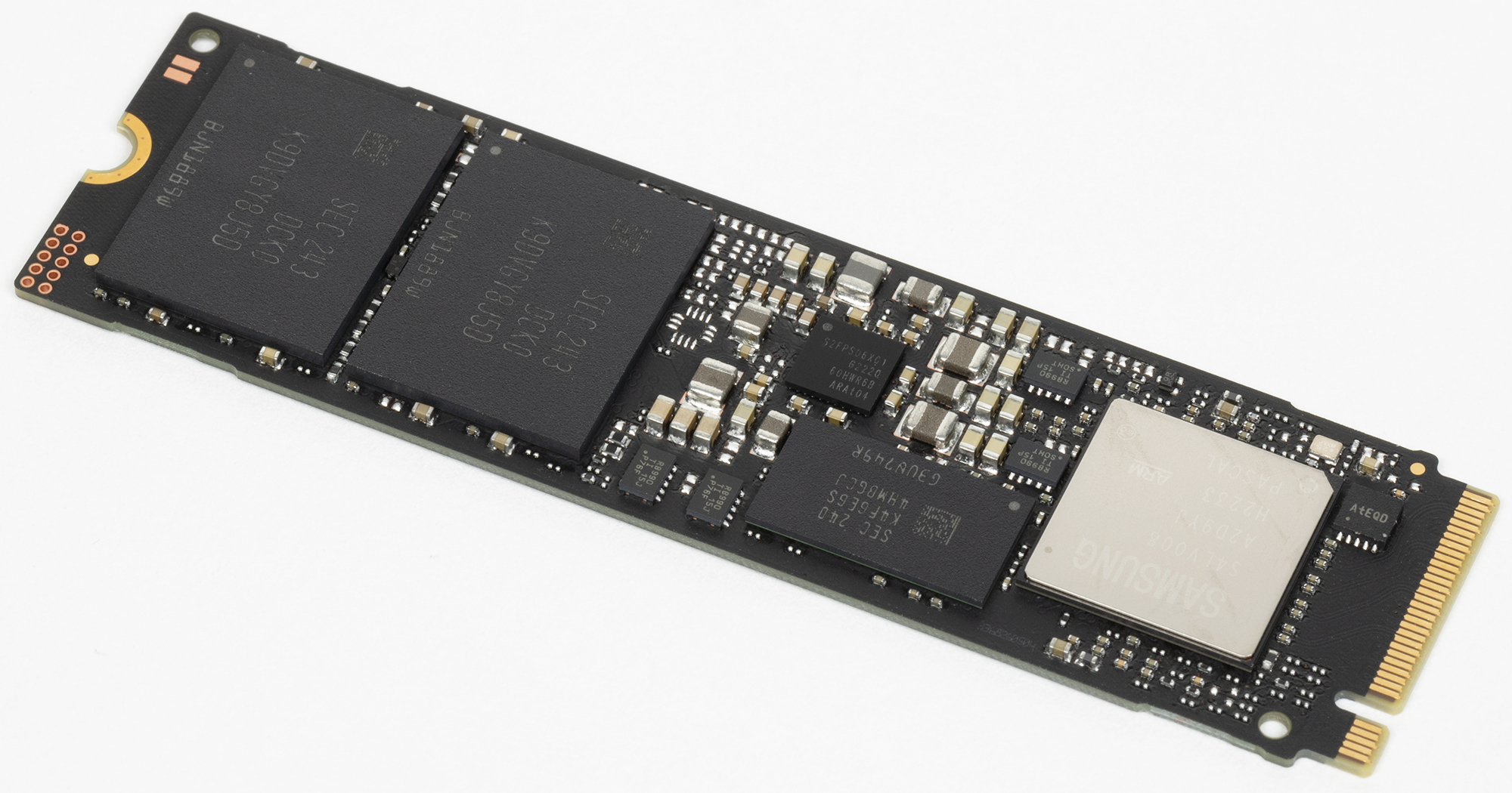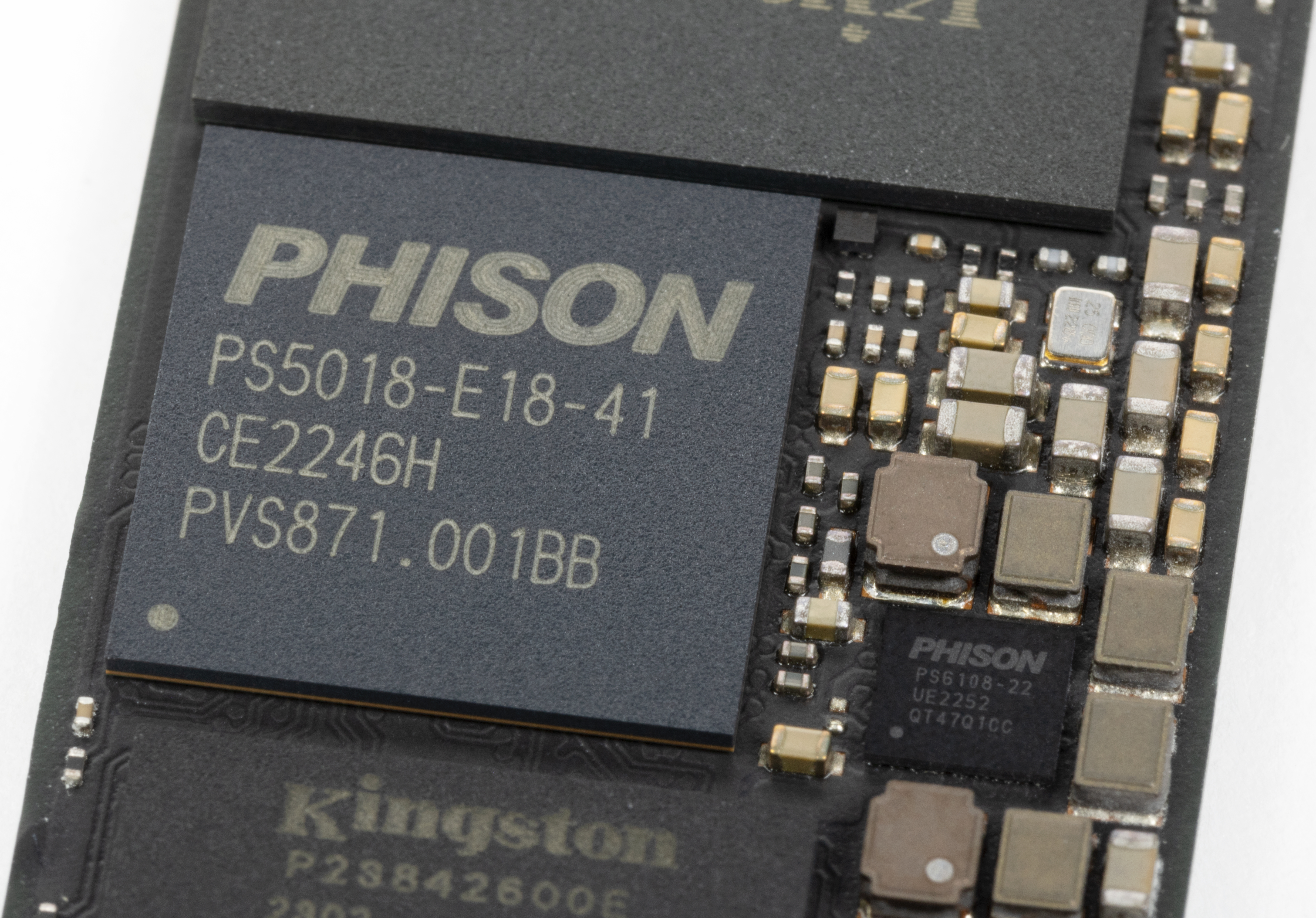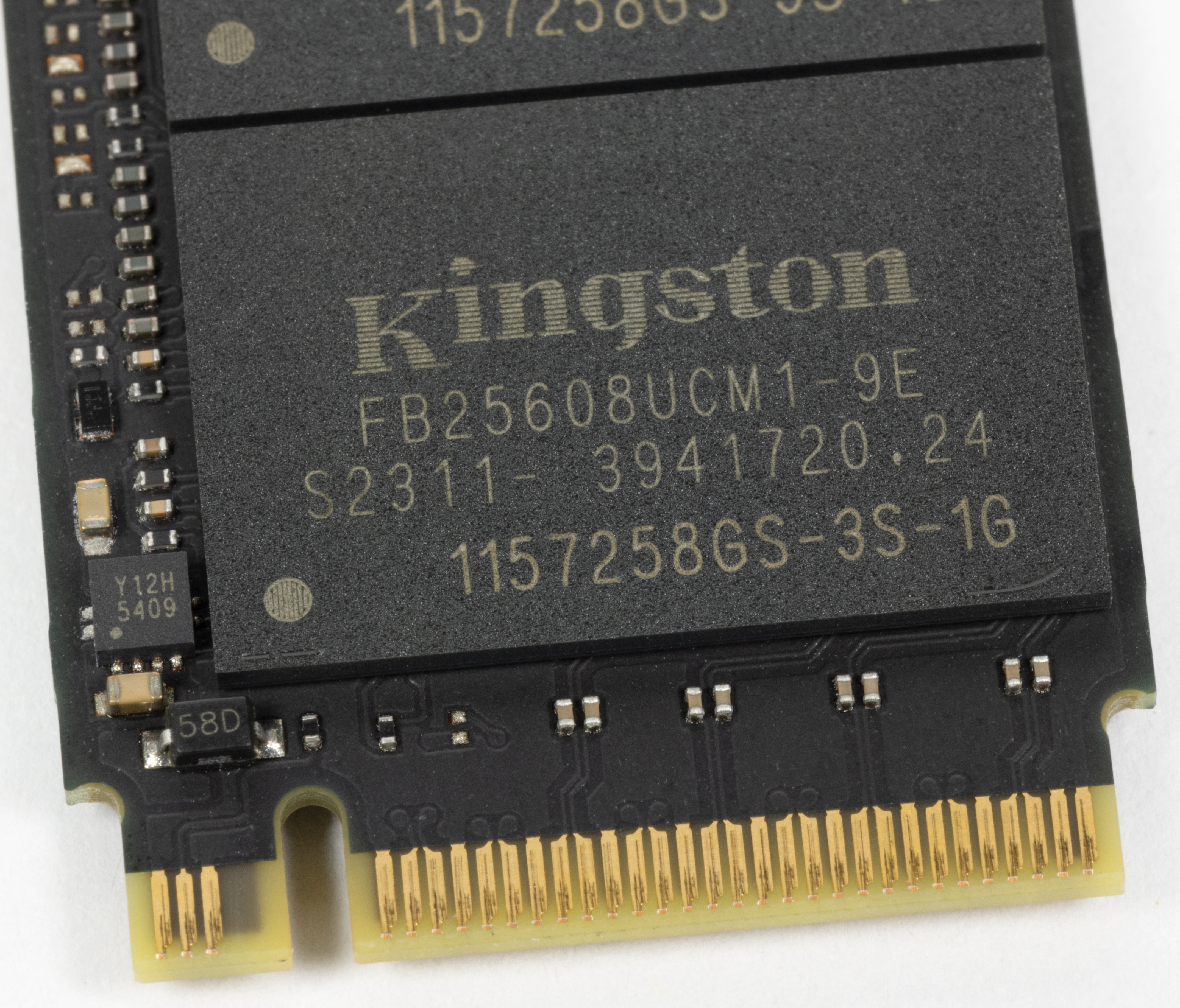 Дизайн самих плат вообще стал стандартным. Терабайтники Kingston обычно отличались от большинства прочих более плотной упаковкой флэша в чипы, что позволило установить не одну, а две микросхемы DRAM. Суммарная емкость — тот же гигабайт, но это удваивало ширину шины обмена данными с DRAM, так что теоретически может увеличить и производительность в некоторых сценариях. Но модификации на 2 ТБ двухсторонние, так что на них спокойно размещаются две микросхемы DRAM по гигабайту — на разных сторонах. И флэш слишком сильно упаковывать не нужно — площадь-то вдвое больше. Поэтому «двушки» уже несовместимы с низкопрофильными слотами М.2, применяемыми в некоторых топовых ноутбуках, что следует учитывать при покупке.