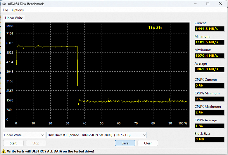 Если бы нагрузка по записи была постоянной и непрерывной, SLC-кэширование лучше было бы вовсе отключить — что и делают в серверных накопителях. В итоге, правда, чудеса в пиках они не демонстрируют — всё имеет свою цену. А скоростные возможности самой связки «контроллер — память» отлично показывает второй проход записи «по мусору». Имеет он чисто научное значение — но имеет. В частности видно, что Micron B47R и сейчас может считать очень быстрой памятью — при правильном использовании хорошие восьмиканальные контроллеры, типа Phison E18 или Silicon Motion SM2264 выжимают из нее до 3,5 ГБ/с. Даже новая платформа WD медленнее, а Samsung 990 Pro в этом плане нас вообще разочаровал. Подчеркнем — в этом. На самом деле, совсем не определяющий практическую скорость тест, но интересный. Вот что можно будет выжать в практических сценариях — сильно зависит от самого контроллера, да и алгоритмов работы SLC-кэширования. Поэтому с ними лучше знакомиться непосредственно.